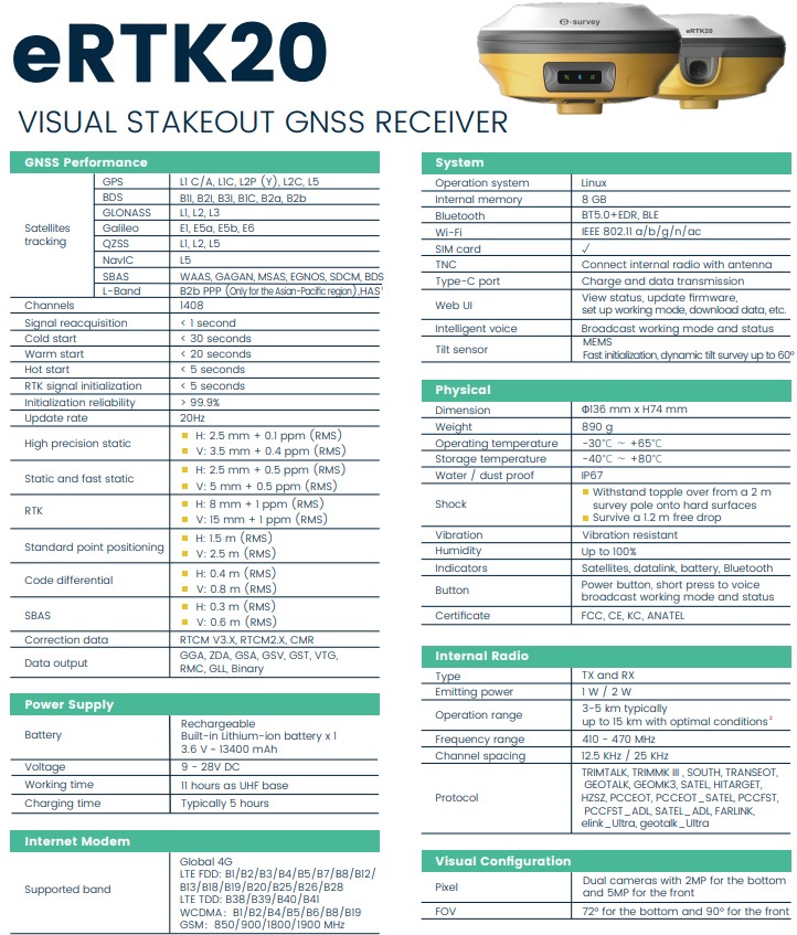 Thông số kỹ thuật máy GPS RTK eSurvey eRTK20