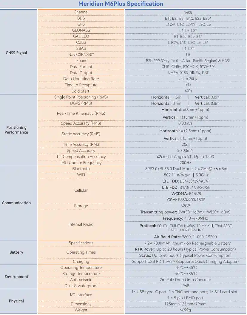 Thông số kỹ thuật máy GNSS RTK Meridian M6Plus