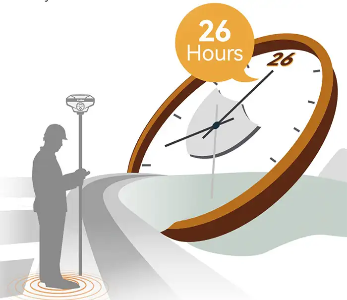 Máy GPS RTK Meridian M20 Lite pin dung lượng lớn cho thời gian làm việc lên tới 26 giờ, đáp ứng trọn vẹn một ngày làm việc ngoài thực địa, đồng thời đảm bảo an toàn dữ liệu, không lo gián đoạn do hết pin.