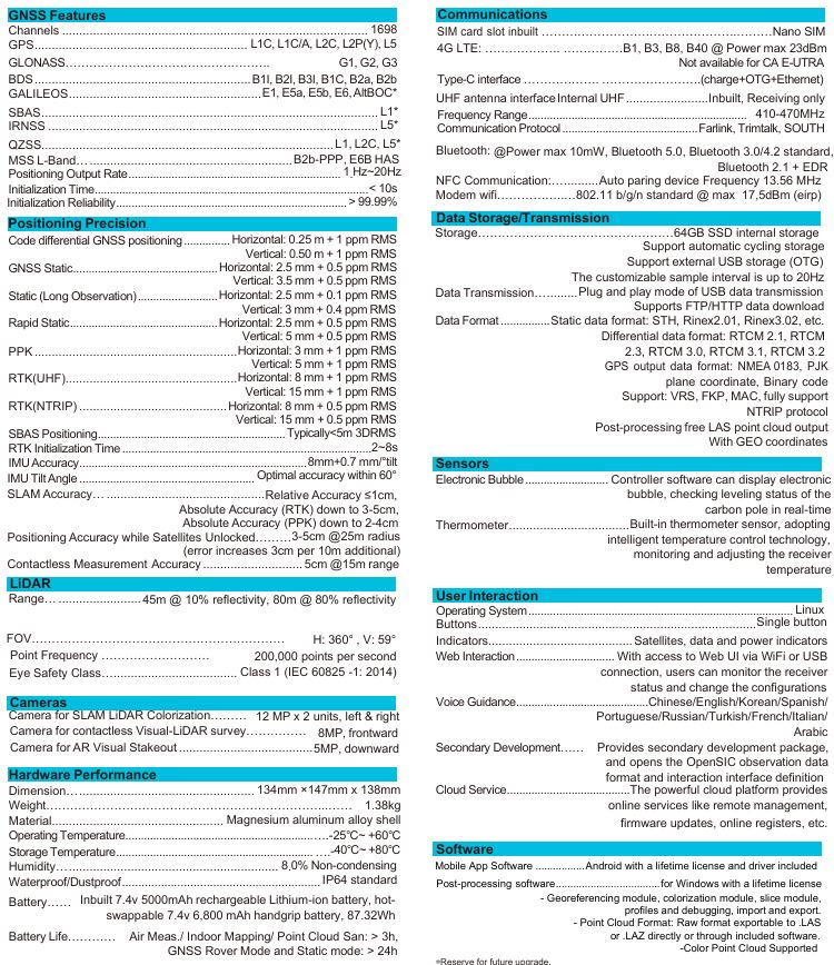 | Thời lượng pin | SLAM: > 3 giờ Rover / Static GNSS: > 24 giờ |